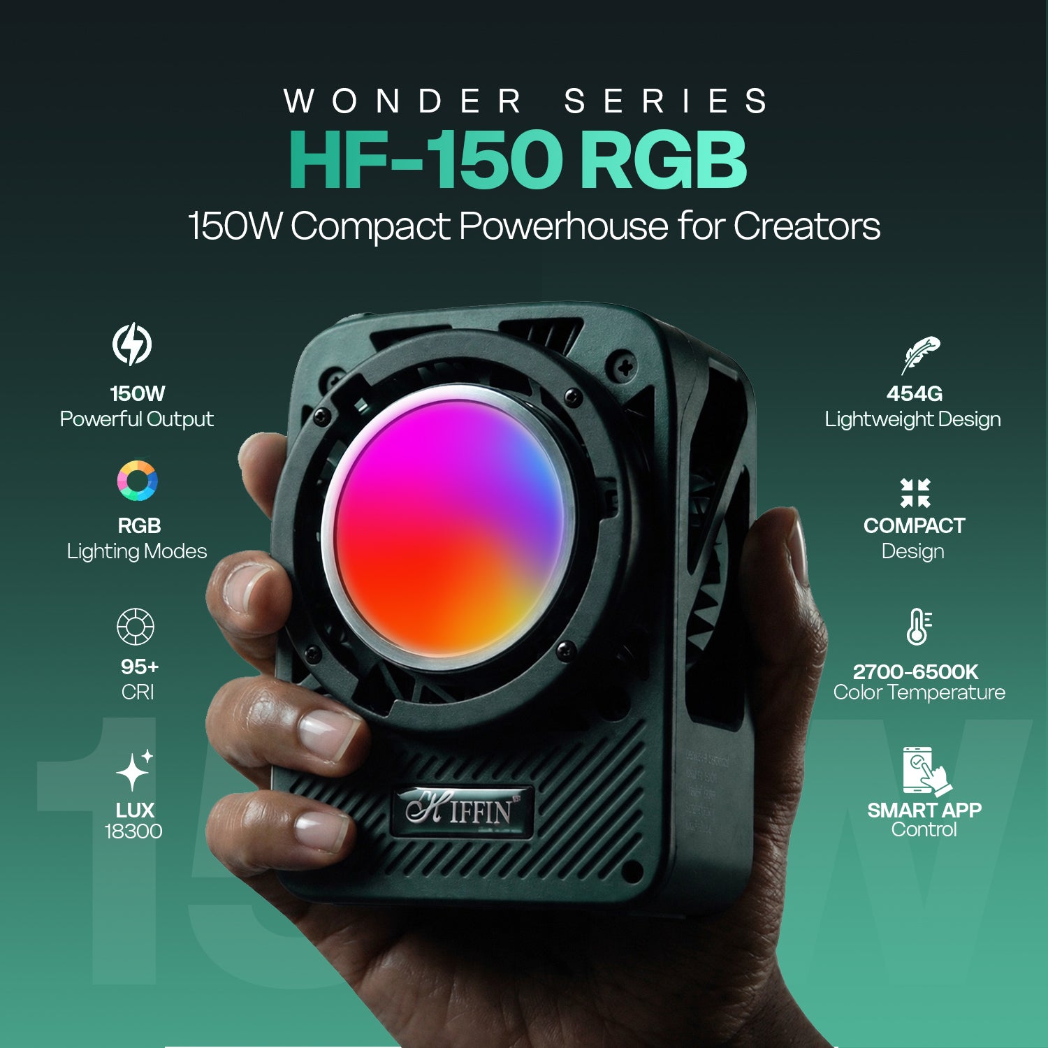 HIFFIN HF-150 RGB Wonder Series LED Video Light is a powerful and versatile lighting solution designed for professionals and content creators who demand high performance and reliability. With a robust 150W output and an impressive brightness of 18300 lumens, it delivers exceptional illumination for photography, videography, filmmaking, and studio shoots.This advanced LED light features full RGB capability along with a wide bi-color temperature range of 2700K to 6500K, allowing you to create the perfect ambiance—from warm cinematic tones to cool daylight or vibrant creative effects. Whether you're shooting videos, reels, interviews, or product photography, this light adapts effortlessly to your needs.