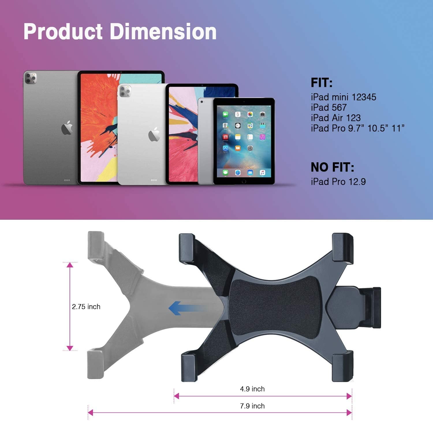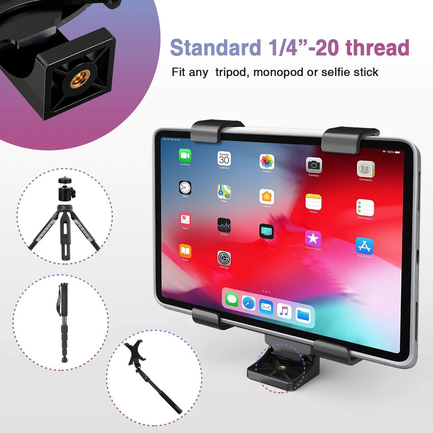 - ✅Universal Compatibility -- The adjustable tablet tripod mount fits any device with 4.9-7.9in width and 0.7in thickness, such as all iPad models (except iPad Pro 12.9"), kindle fire, Samsung Tab, Microsoft surface. Even can be used for cell phone which of width is longer than 2.75in