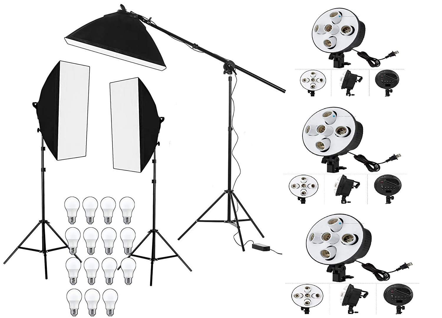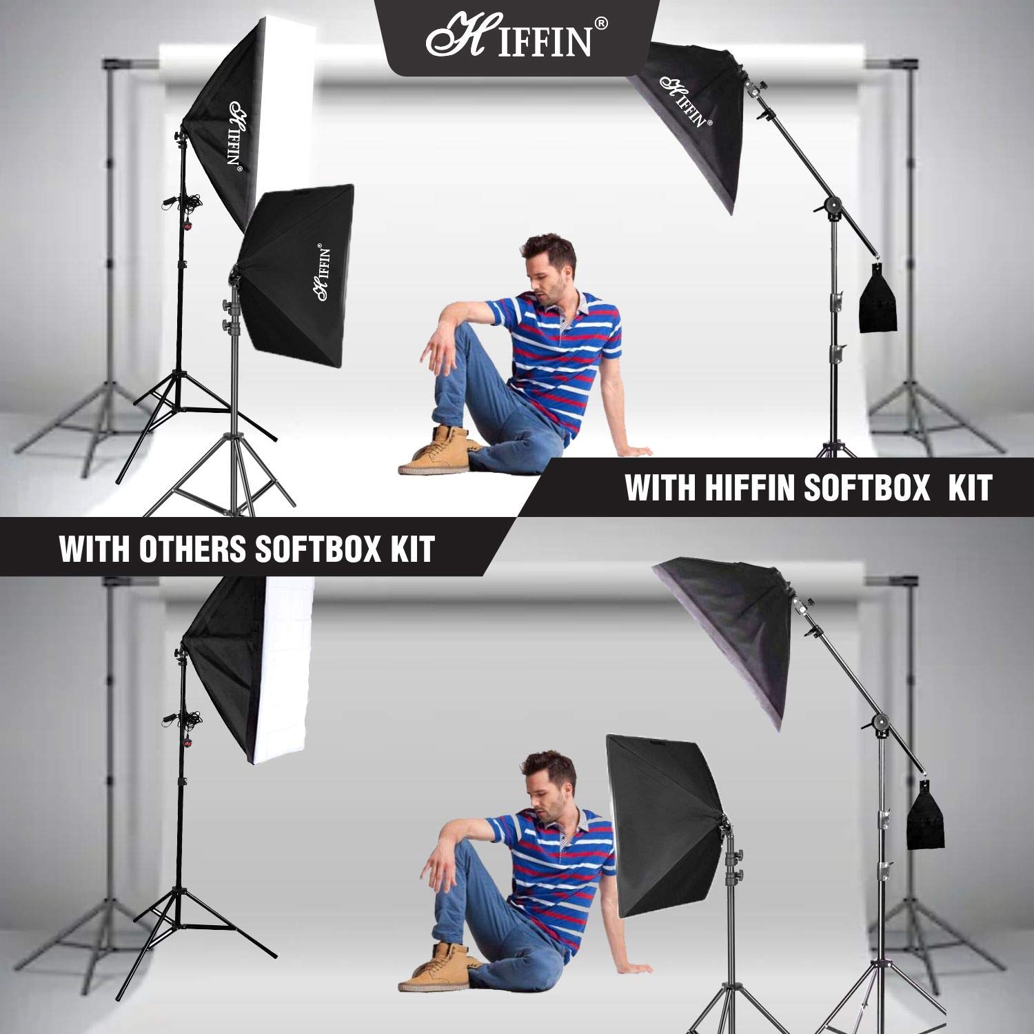 - [Contents Of The Deal]: This super exciting deal by HIFFIN contains 3 of LED Video Light with AC Power Cord | 15 Super-bright Bulbs 18 watt | 2 of Mark 9FT Light Stand | 3 of 50cm x 70cm Big Softbox | 1 Bag for Stands | 1 Boom stand