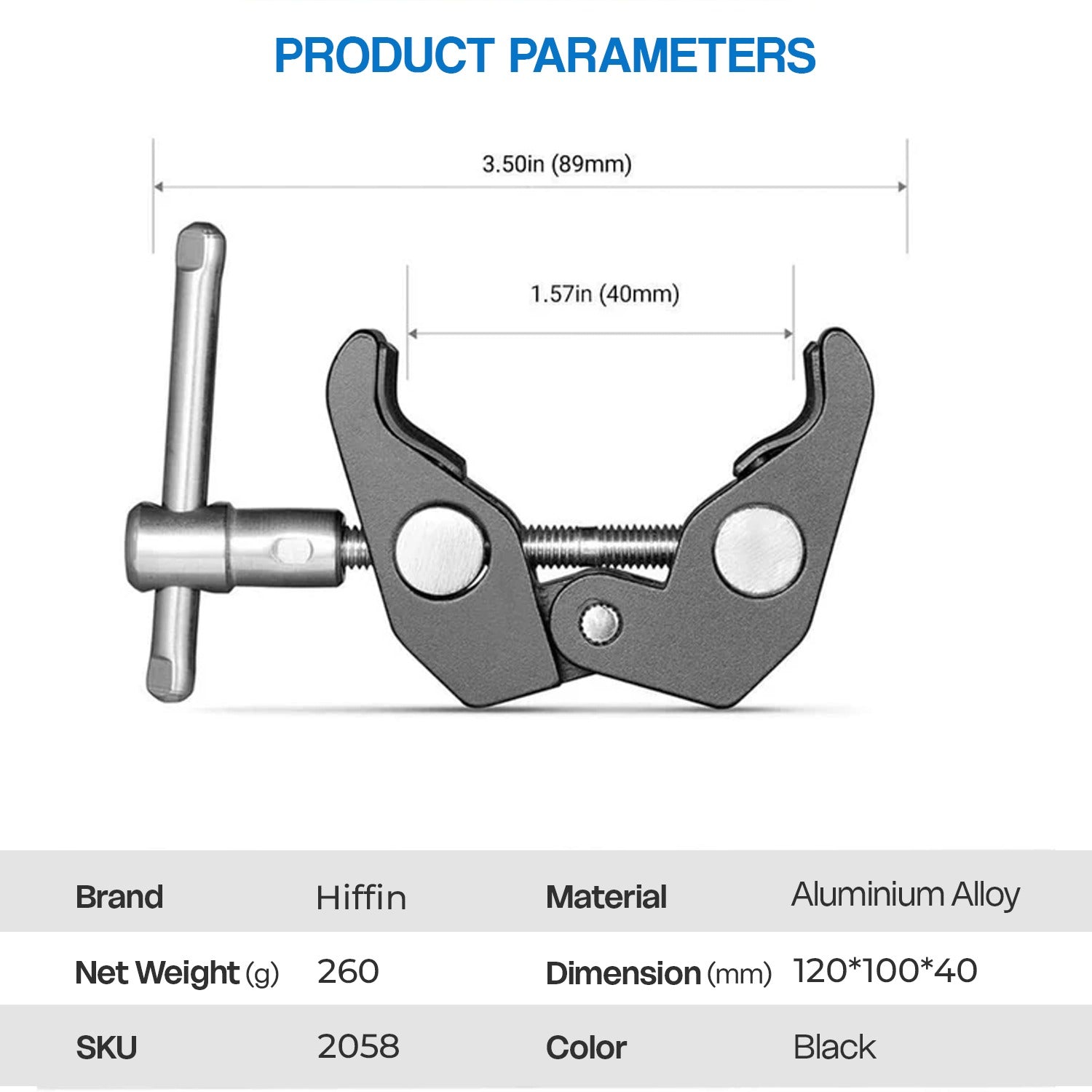 • Strong construction.This Super Clamp is made of lightweight Aluminum Alloy and stainless steel.Net weight: 4.6oz. .Best Weight Load:0.5-2.5kg.