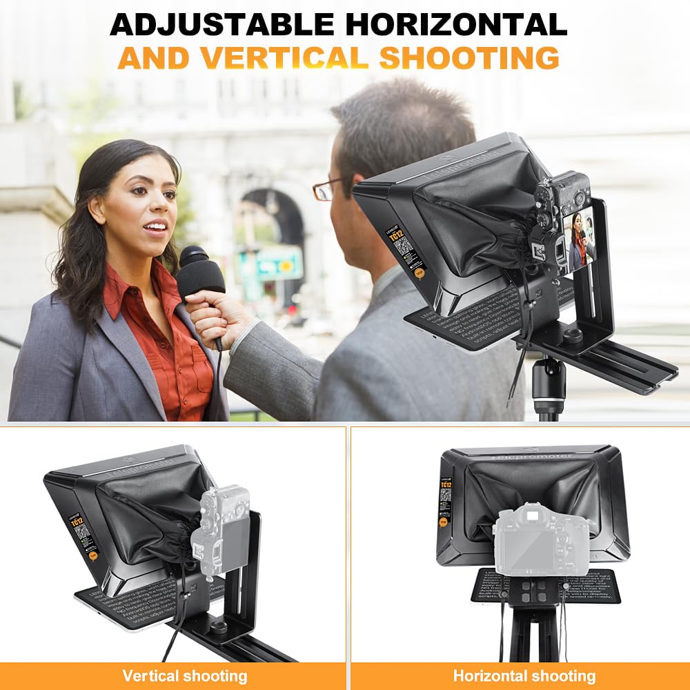 - WIDE DEVICE COMPATIBILITY:TC12 teleprompter can be used with multiple camera models,compatible with iPad iPad Air iPad Pro up to 9.7’’~12.9" etc. Its lens hood can be adjusted to suit camera lens of various sizes ensuring flexibility and versatility for different filming needs