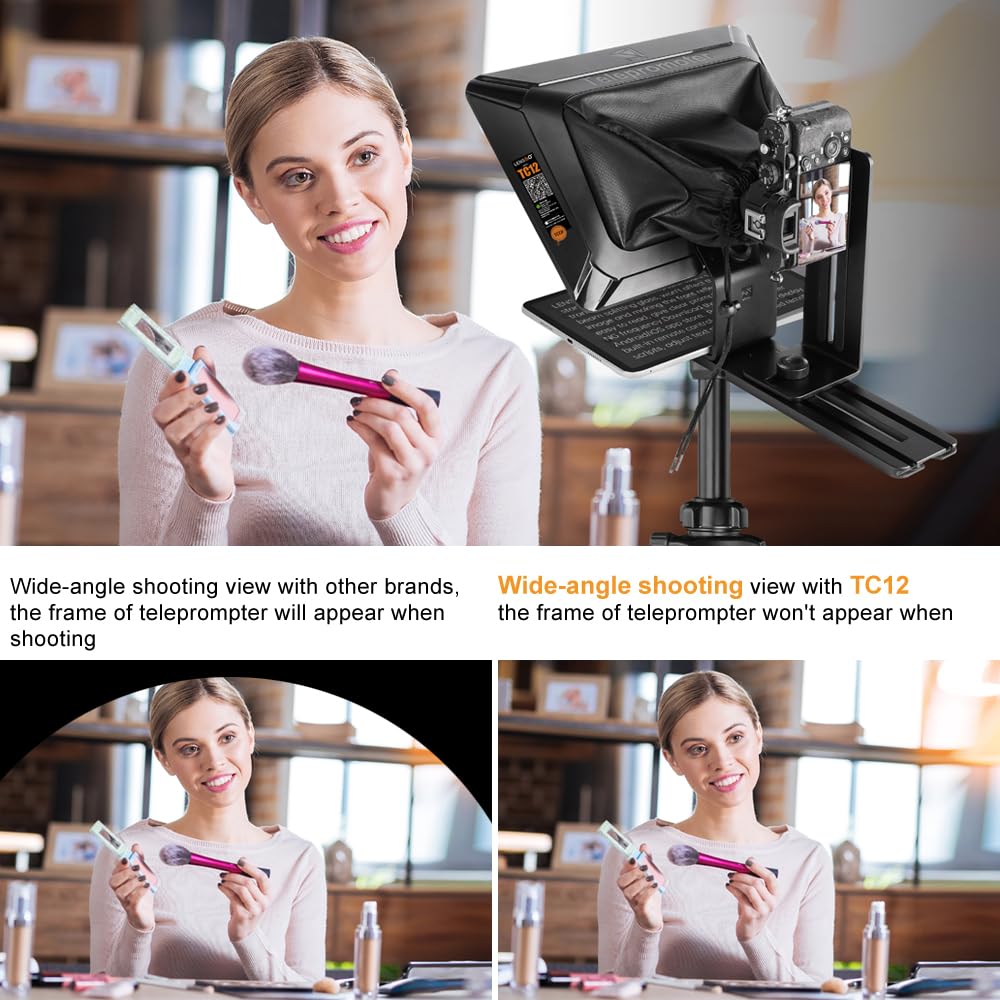 - EFFICIENT VIDEO ACCESSORIES:Our TC12 Teleprompter Allows you to clearly read scrolling text while looking directly into the camera. Perfect for live broadcast,vlog, online class, video recording, interviews, presentation and so on. Give great help while live streaming or recording. Bring you a better shooting experience