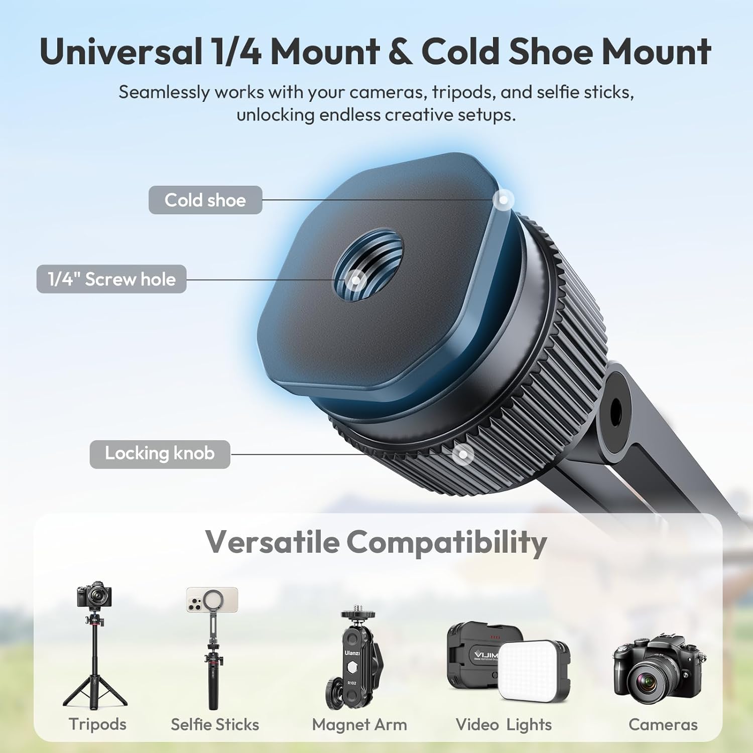 - 【Effortless for MagSafe Magnetic Attachment】 Engineered with built-in strong magnets, this mount aligns perfectly with iPhone series and MagSafe cases. Universally compatible with metal ring-equipped phones, it enables one-handed detachment. The 1/4" expansion port and cold shoe base support tripods, selfie sticks, video lights, and more.【**Not compatible with non-MagSafe cases or devices without MagSafe functionality.】