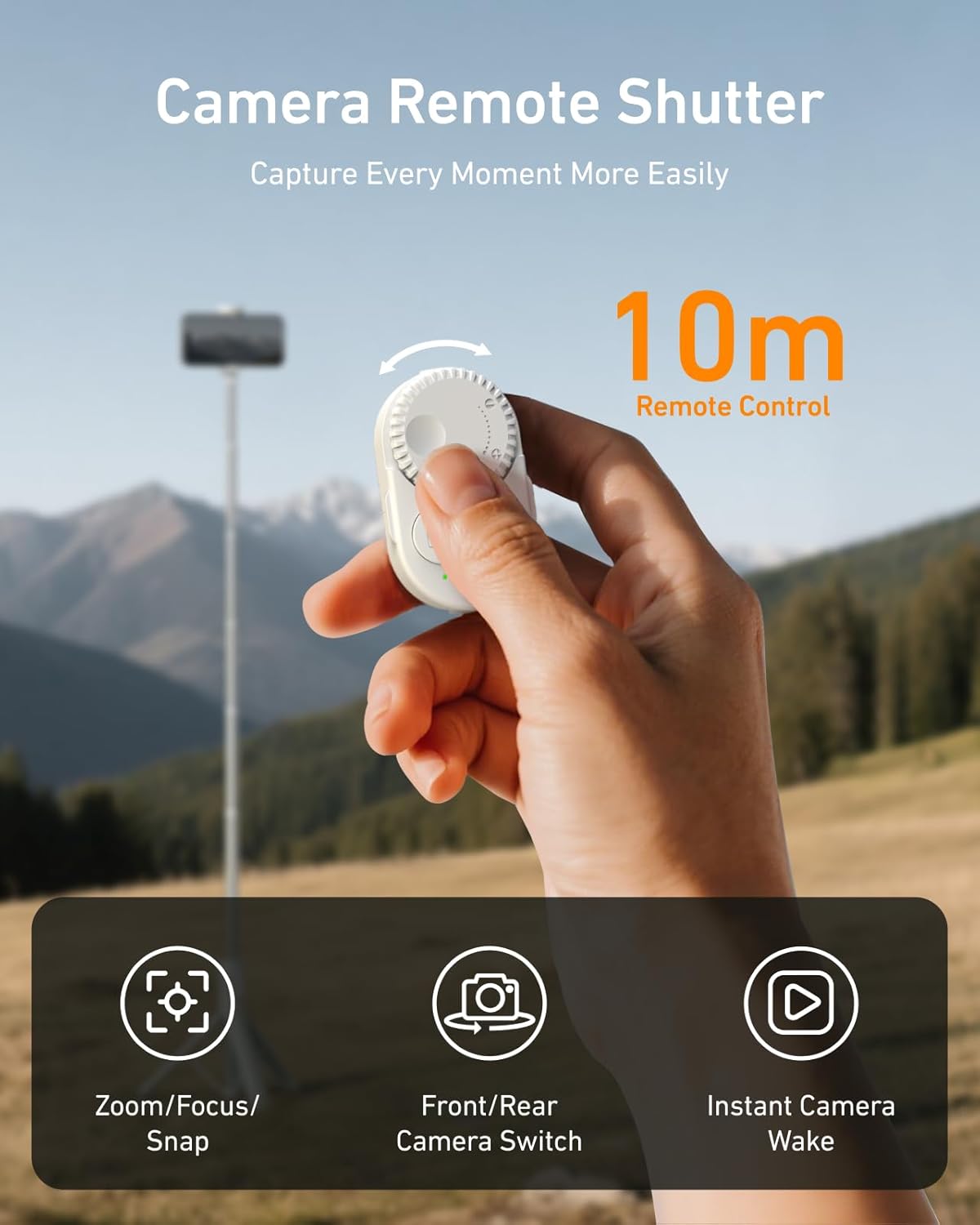 - Selfie Stick Tripod with Remote: Compared to other single function remote controls, our selfie stick wireless remote control not only has a shutter function, but also zoom, focus, switch front /rear cameras, scroll through short videos, like content, and flip pages etc. Whether you're shooting photos, recording videos, browsing TikTok, or reading eBooks, it handles it all with ease. The phone holder remote securely snaps into the body of the selfie stick, so it won’t get lost and is safe to carry around.