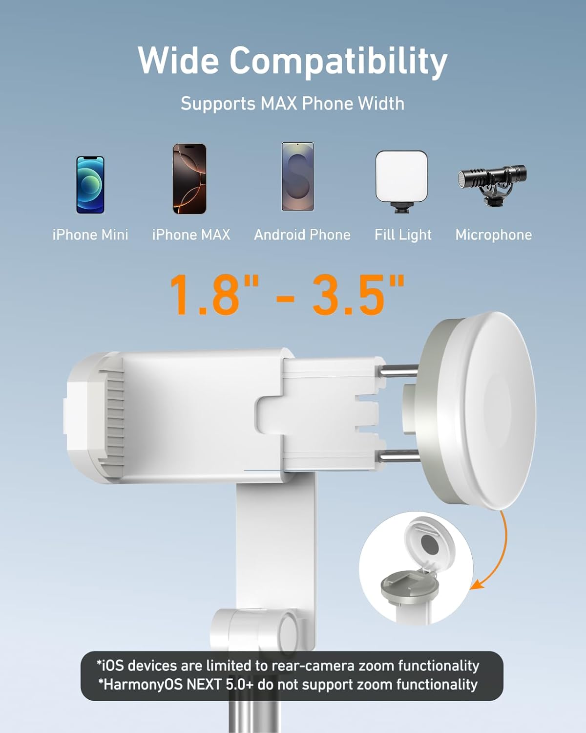 - Lightweight & Portable Tripod: This selfie stick standard adoption foldable design, making it super easy to carry in a backpack. It’s great for hiking, travel shots, family days and more. The tripod stand fits devices 1.8 - 3.5" wide, making it compatible with most smartphone (for example: iPhone 16 Pro Max, iPhone 15, Samsung Galaxy S25 Ultra etc.)The clamp has a non-slip, scratch-resistant design to keep your phone secure and protected at all times.