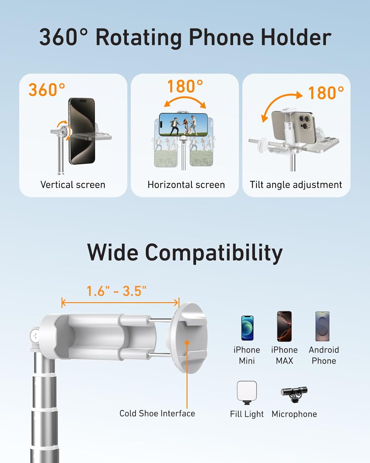 - Built-in Cold Shoe Mount: Features an integrated cold shoe mount directly on top of the phone holder, allowing you to easily attach essential accessories like an external microphone (mic) or video light for enhanced audio and professional lighting while filming hands-free or capturing selfies. Upgrade your vlogging gear seamlessly.