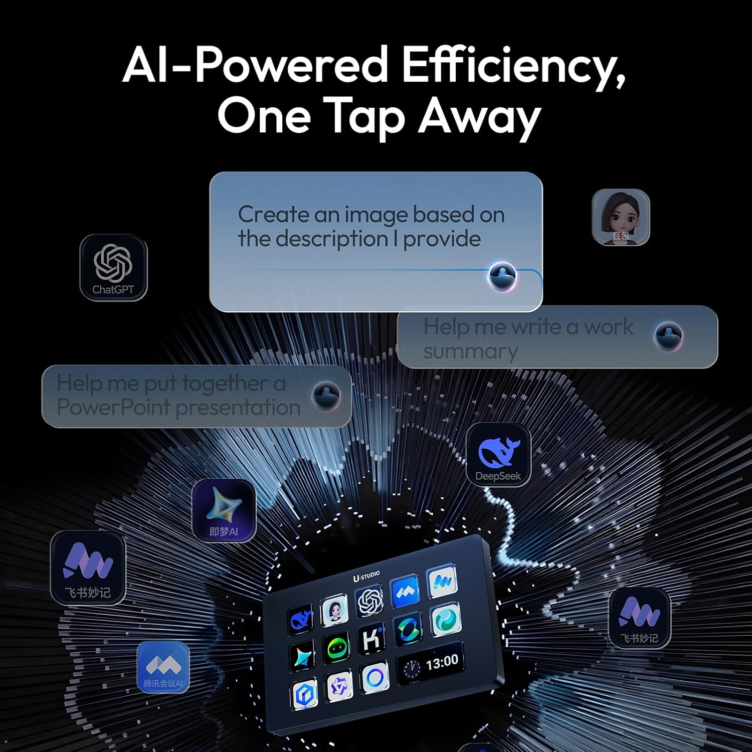 - Content Creation---instantly open menus, select tools, merge layers, pick tracks, and import files—making photo, video, and art work effortless. Supports Ps, Pr, Ae, DaVinci Resolve, and CapCut; Office Assistant---works with ChatGPT, Deepseek, Excel, and more office apps. One tap to launch apps, start calls, share screens, switch windows, and open files; Streaming Control---one tap to start streaming, switch scenes, send presets, and control lights and sound for an engaging solo show.