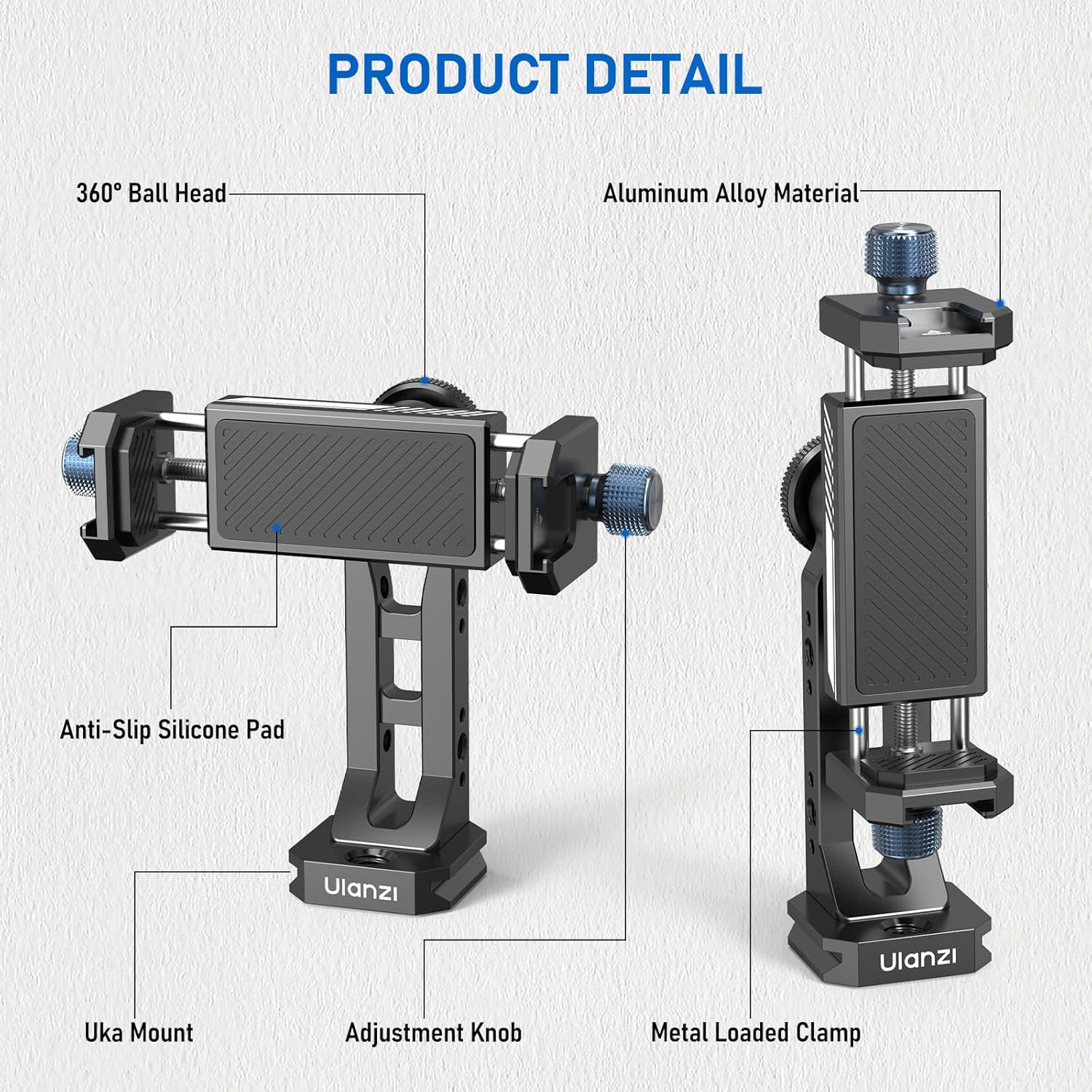 - 【Ulanzi MA53 Metal Phone Tripod Mount】: Equipped with 360° rotation & 180° Tilt smartphone holder with cold shoe*2 and 1/4" Thread hole *5, 3/8" Thread hole *1, you can attach additional LED light, microphone or magic hand, enhancing your videos, streams, vlogs, and photography. It's an essential tool for YouTubers, Vloggers, and outdoor photographers.