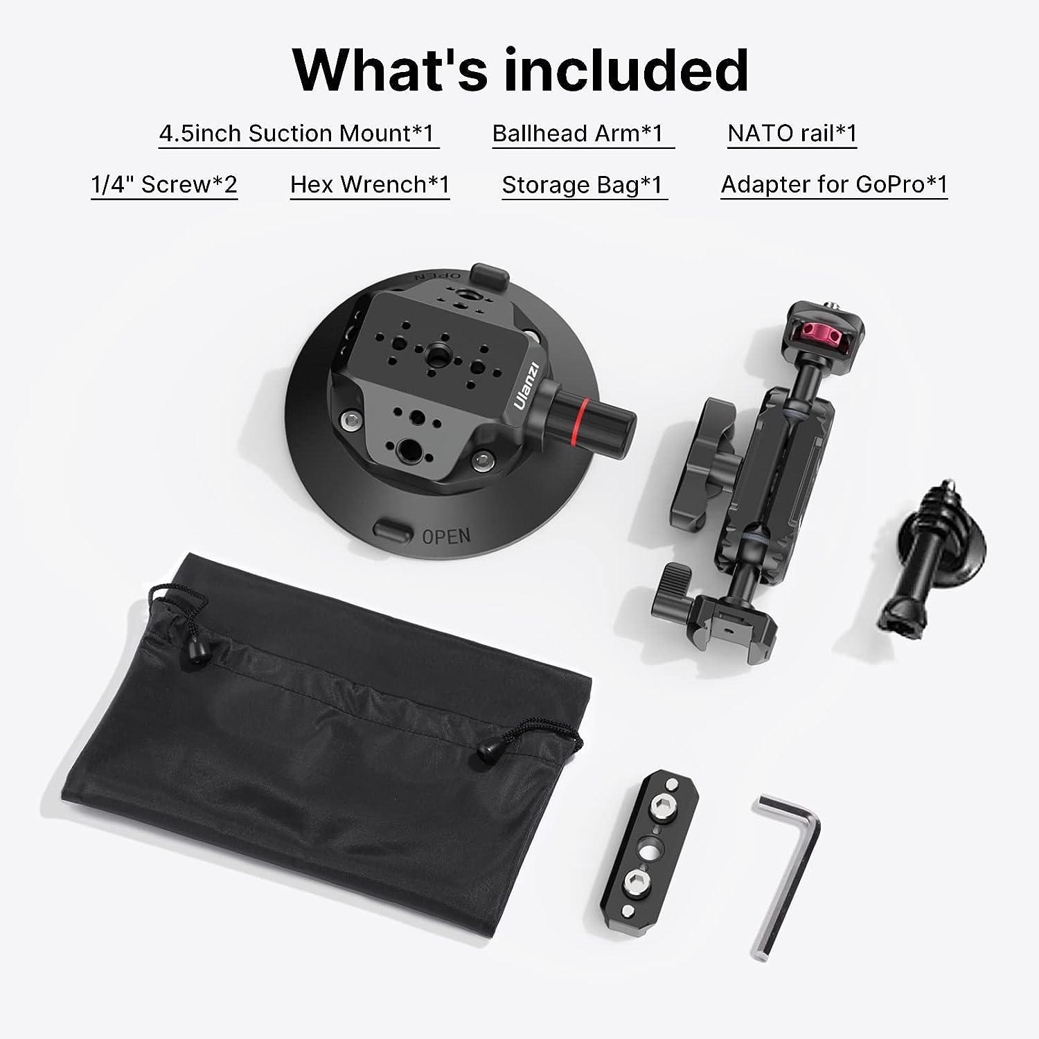 - What's Included: 4.5inch suction mount*1; ballhead arm mount*1; NATO rail*1; 1/4" screw*2; Hex wrench*1; Storage bag*1