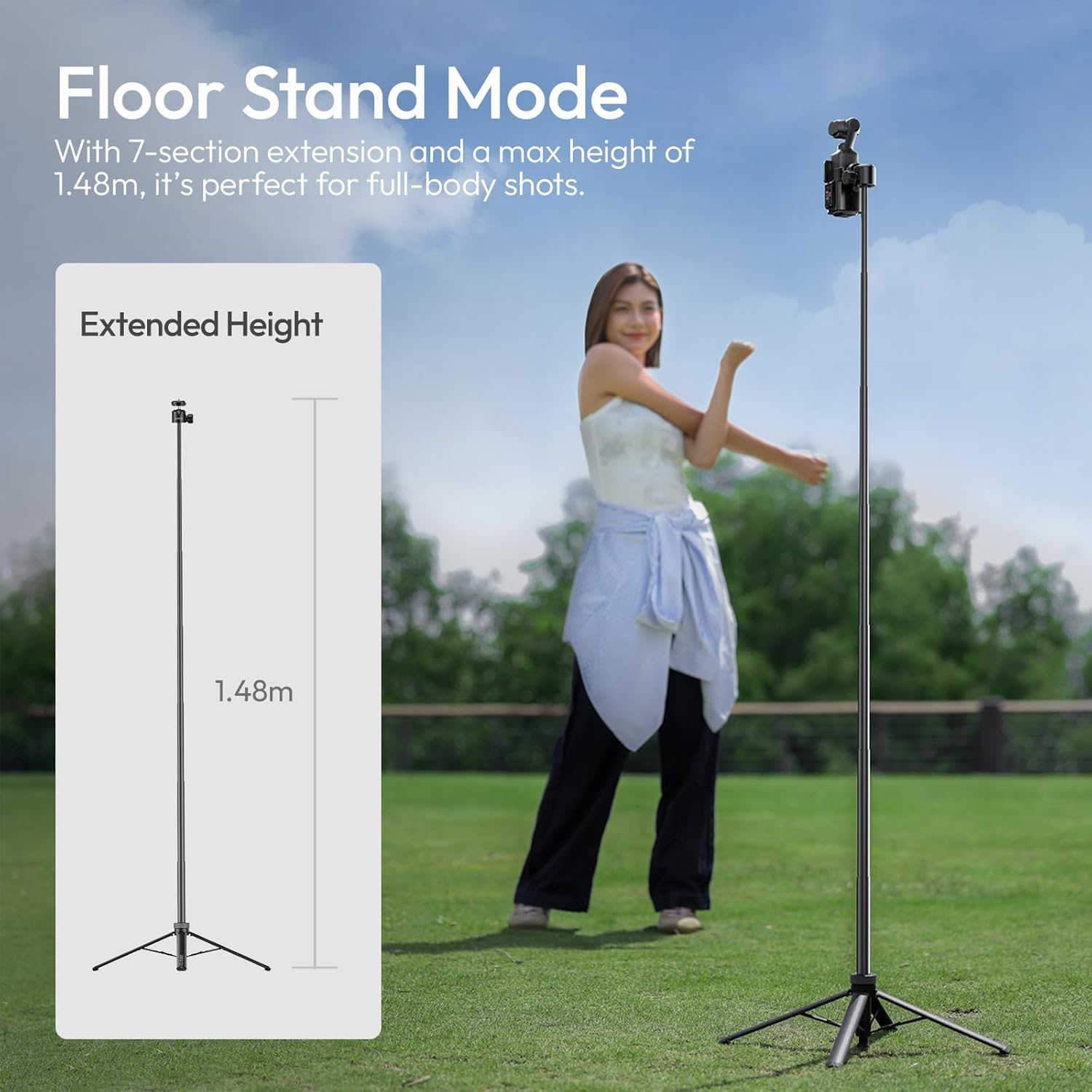 - 【Two modes, versatile applications】It can switch between selfie stick mode (1.46m) and floor selfie stick Tripod stand mode (1.48m), with seven-section telescopic adjustment, making it easy to shoot panoramas and selfies.
