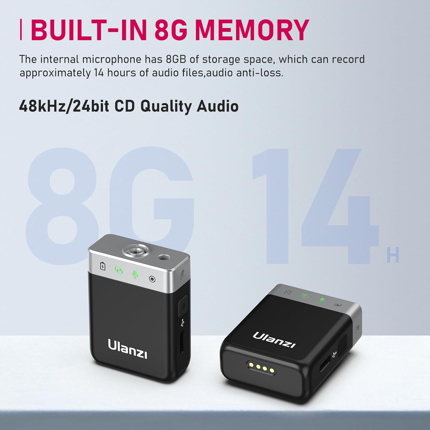 - 8GB on Board Recording✓ Both transmitters have onboard recording capabilities with 8GB of storage each, allowing for up to 14 hours of backup recording, enabling you to record audio directly to each transmitter as a backup in case of wireless interference or dropouts. The transmitters can also be used as standalone recorders.