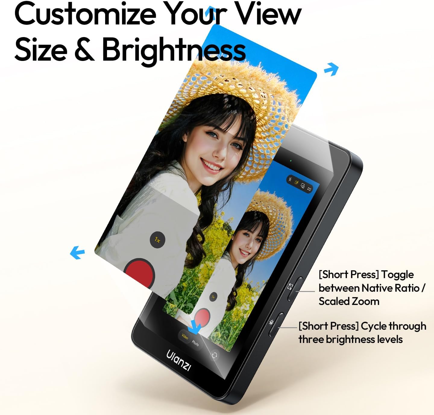 • 【Customizable View & Brightness】Short-press to toggle native ratio/scaled zoom or cycle through 3 brightness levels on the selfie monitor screen—tailor your view for perfect framing.